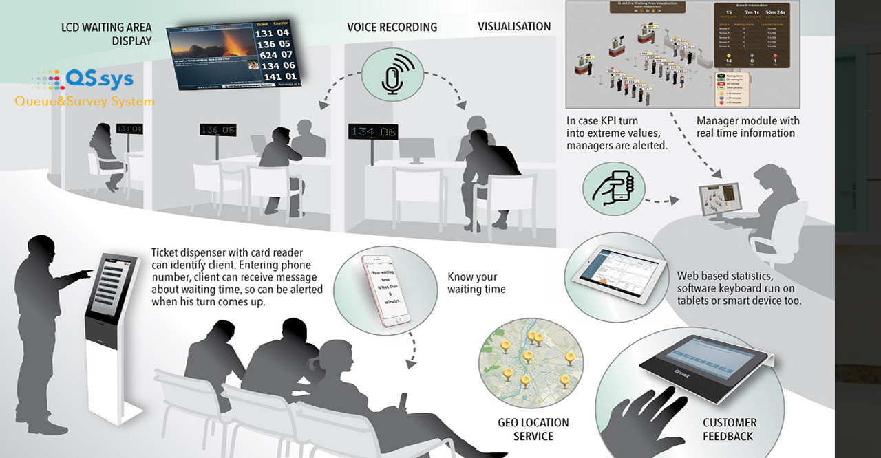 Hệ thống quản lý xếp hàng lấy số thứ tự QSSys hỗ trợ cả hai kiến trúc tập trung và phân tán. Tất cả đều dựa trên nền tảng web, do đó, nó có thể được sử dụng với PC, máy tính bảng, điện thoại thông minh, v.v.